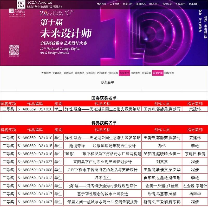 近日,由工业和信息化部人才交流中心主办的“第十届未来设计师·全国高校数字艺术设计大赛”(NCDA)顺利落下帷幕,米兰官网园林学子摘得国家三等奖1项,河南省一等奖1项、二等奖6项、三等奖2项。