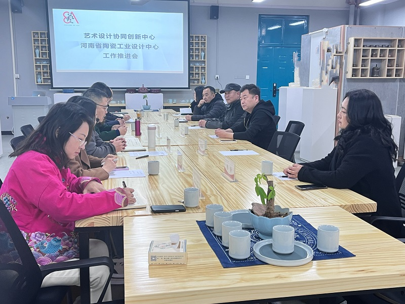 2023年2月17日下午,ac米兰官方网站在龙子湖校区尚严楼ac米兰官方网站陶瓷创研中心召开“艺术设计协同创新中心及河南省陶瓷工业设计中心”工作推进会。副校长杨国宇、科学技术处处长潘春梅、亚坤集团监事会主席、徽汝汝瓷总经理曹二虎、九和包装总经理王伟峰、河南省陈设艺术协会主席曾志刚、秘书长韩婧、ac米兰官方网站领导班子成员、协会代表参加研讨会。会议由ac米兰官方网站党委书记王国辉主持。