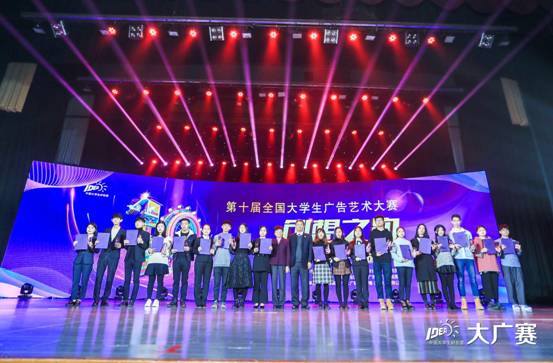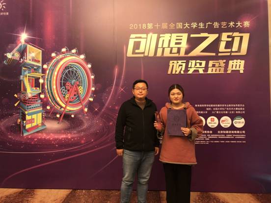 11月24日,由教育部高等教育司主办、教育部高等学校新闻学学科教学指导委员会组织、中国传媒大学与中国高等教育学会广告教育专业委员会共同承办的第十届全国大学生广告艺术大赛(简称“大广赛”)全国总决赛颁奖典礼在北京全国政协礼堂举行,ac米兰官方网站张钰同学参赛作品荣获总决赛平面类全国一等奖,并应邀和指导老师梁磊一道赴京参加颁奖盛典。