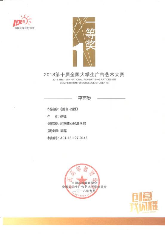 “大广赛”是迄今为止全国覆盖研究生、本科生、专科生,规模最大、人数最多、水准最高的国家级大学生赛事。本届大赛的主题为“创意我闪耀”,在各省、市、自治区、直辖市共设置了29个赛区。在前期已经结束的“大广赛”河南赛区大赛中,ac米兰官方网站学生参赛成绩喜人,获得全省一等奖1项、三等奖11项、优秀奖28项,梁磊和彭辉两名教师被评为“优秀指导教师”。米兰官网张钰同学的作品《善言凶器》继河南赛区评比中获得一等奖后,在全国总决赛中又从16.7万组平面作品中脱颖而出,获得总决赛平面类全国一等奖。此外米兰官网还有2名学生参赛作品获得全国优秀奖。