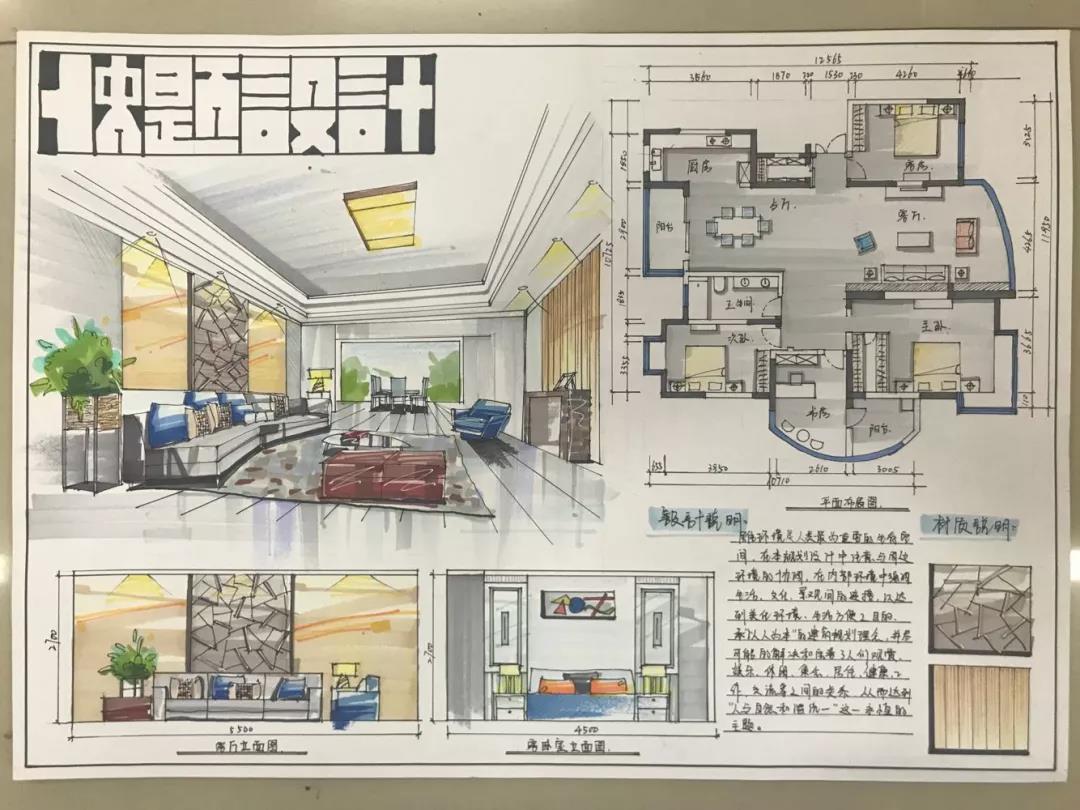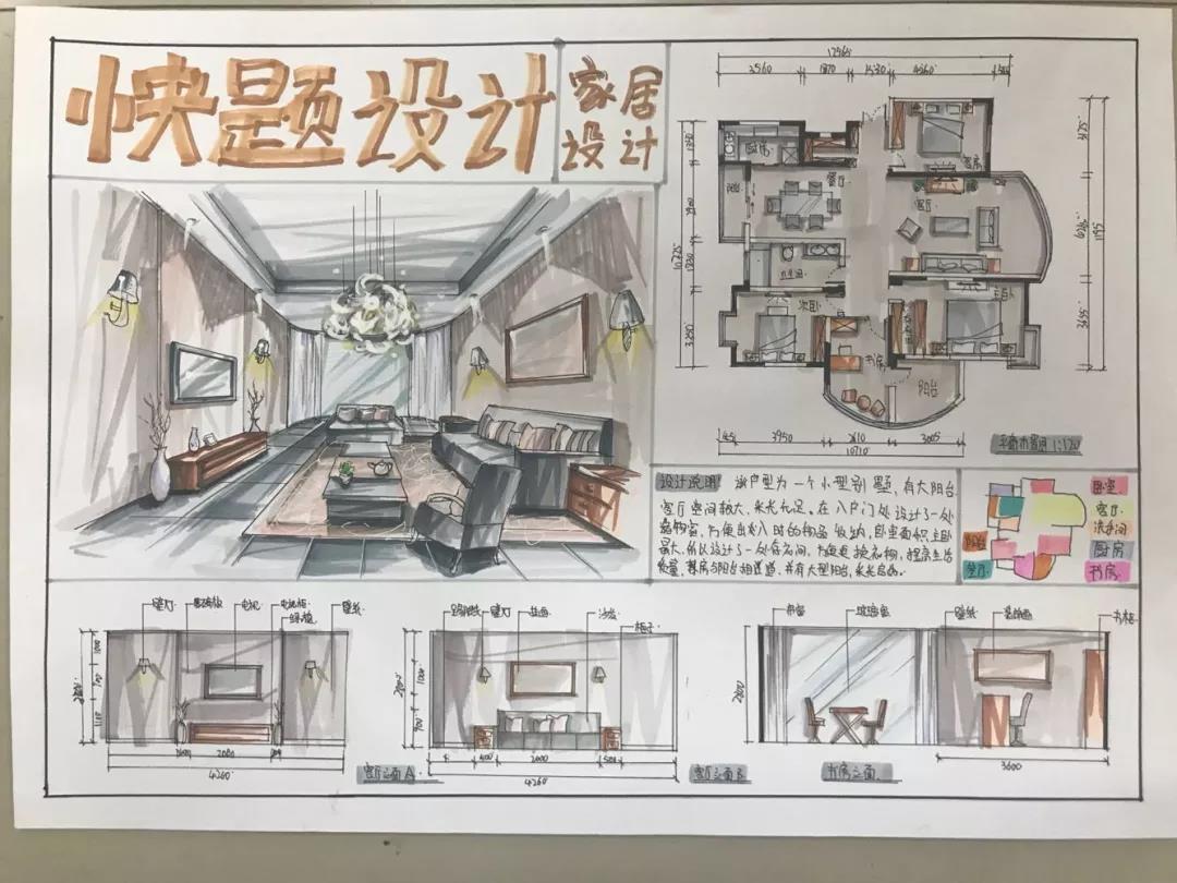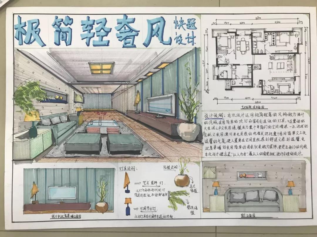 考核过程及内容:本次课程考核要求学生们在四个小时内,以手绘快题的形式,按照提供的平面图在A3图纸上设计绘制出一套完整方案。从最终作业的呈现上看,学生们从刚开始接触手绘时略显稚嫩的平时作业,到6周结课时初露锋芒甚至略显老道的结课作业,充分印证了学生们一步一个脚印的成长过程。