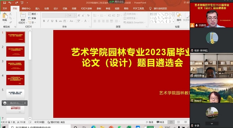 为切实做好2023届本科毕业生毕业论文(设计)选题工作,规范论文(设计)选题,确保毕业论文(设计)质量。2022年10月23日,园林专业通过腾讯会议顺利召开了2023届毕业论文题目遴选会。遴选会邀请西北农林科技大学硕士生导师张胜博士、我校社会服务办公室胡华锋主任在线指导。ac米兰官方网站田志涌副院长、园林教研室主任左金淼老师、副主任宗建伟博士及园林教研室全体老师参加了遴选。