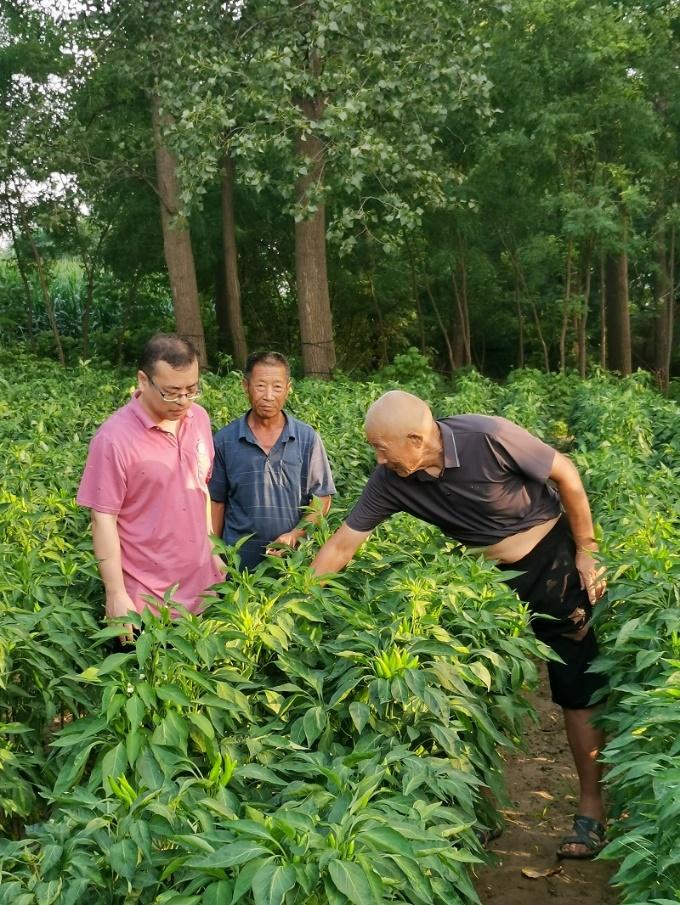 近期受台风“杜苏芮”和“卡奴”的影响,河南高温多雨湿热的天气持续,尽管台风带来的降雨有利于缓解高温、补充墒情,但易导致农作物植株旺长和病虫害多发。宗建伟老师来到田间地头与种植户进行了详细的交流,掌握强降雨后的辣椒生长状况、讲解了辣椒水分管理及病虫害发生情况,并进行了现场指导。针对遇到的问题提出了主要预防的对策和建议:首先,对于低洼积水的田地,及时开沟排水,加强水肥管理,提前备好排涝机具,防止辣椒出现长时间、大面积内涝,造成农作物早衰、死亡;其次,注意加强病虫害防治工作,可用生物菌剂灌根防控,以预防由真菌引起的疫病、炭疽病;还可以喷施烯啶虫胺等药物,以防治蓟马等害虫。最后,注意土壤补肥及叶面喷施补素肥等日常管理措施。