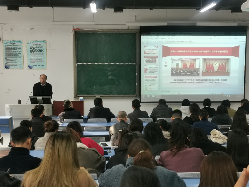 为深入学习宣传贯彻党的十九届四中全会精神,12月12日下午,ac米兰官方网站在1号教学楼304举办了十九届四中全会宣讲报告会,宣讲会由院党委书记王在钦主讲,学院全体师生党员参加并聆听了此次报告会。