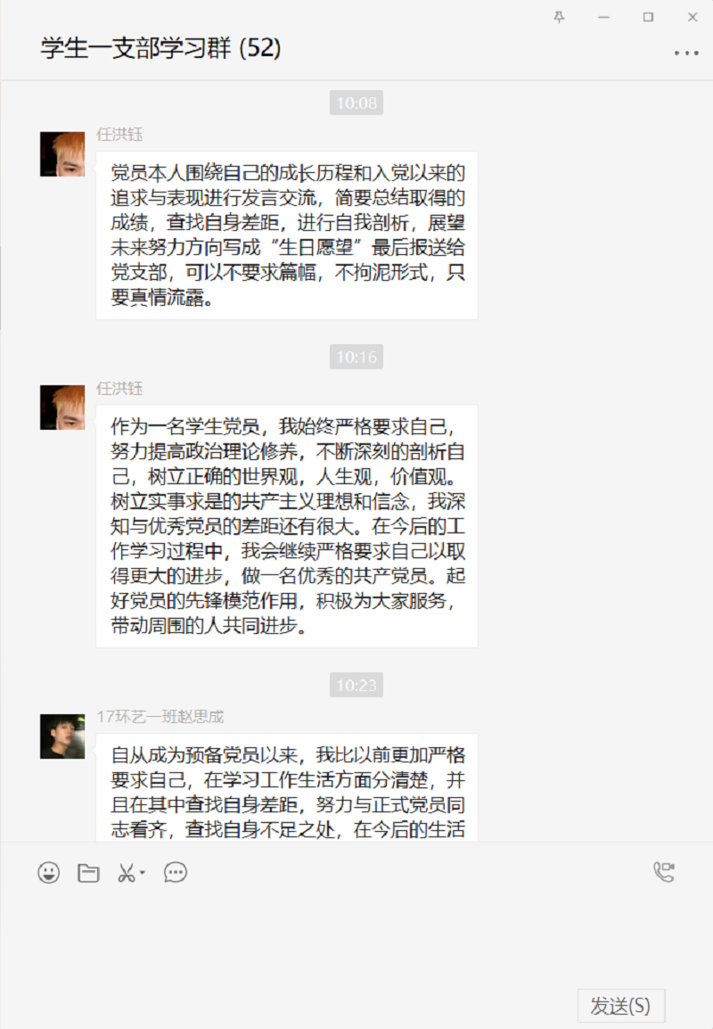 活动进行的第五项是党员同志们围绕自己的成长历程和入党以来的追求与表现进行发言交流,大家真情流露,简要总结了取得的成绩,查找自身差距,进行自我剖析,展望未来努力方向,争做优秀的社会主义建设者和接班人。