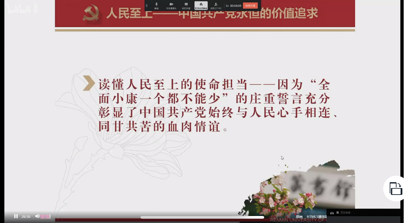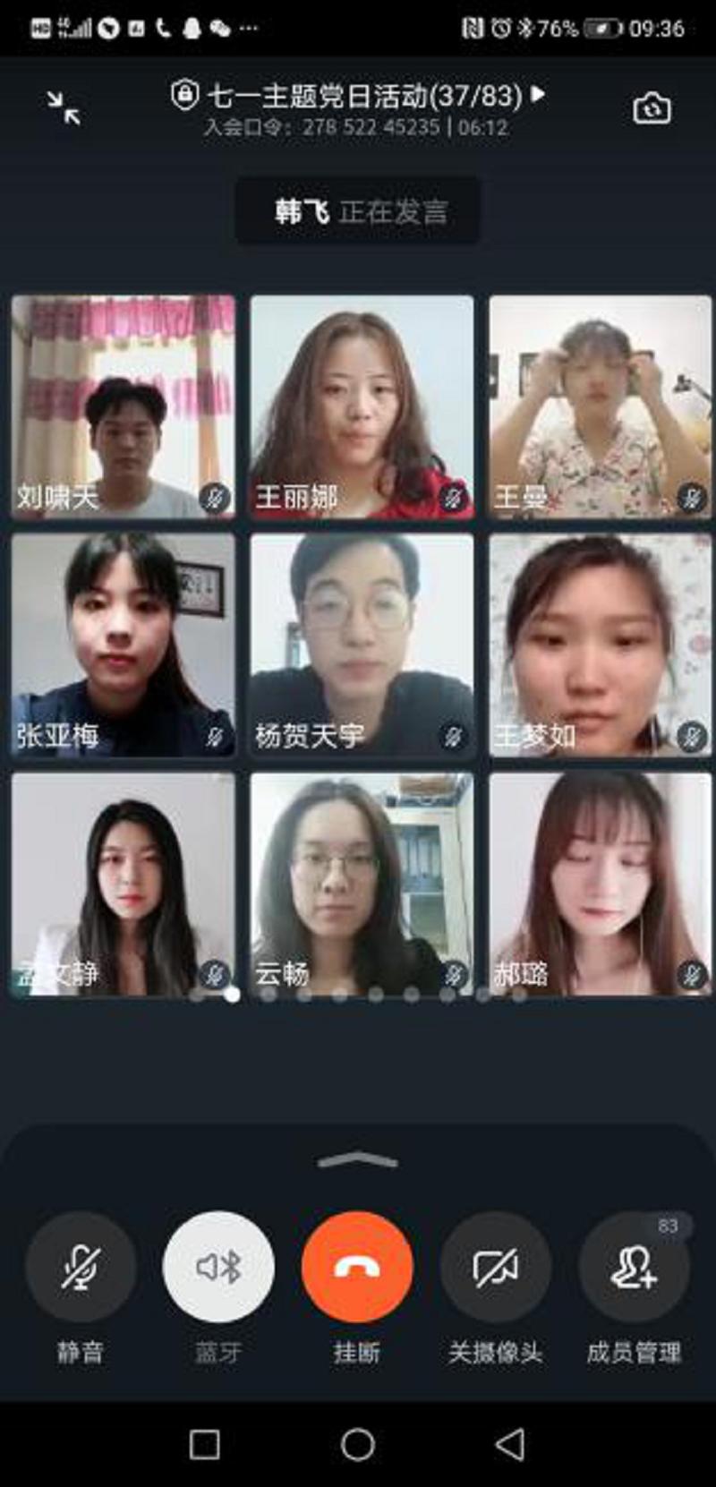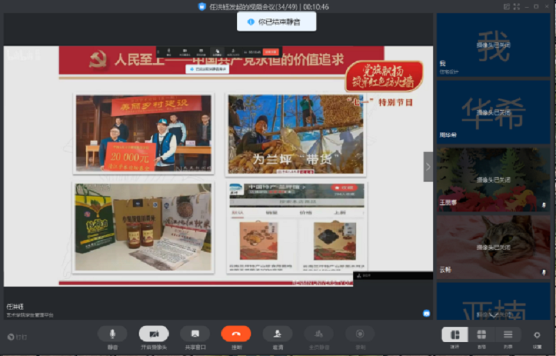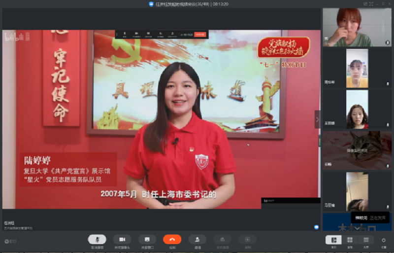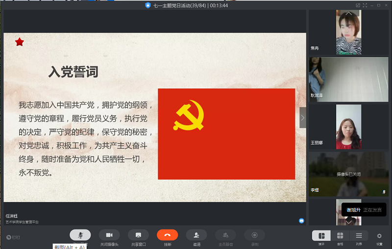 活动第二项是重温入党誓词。面对中共党旗,由党支部书记韩飞老师领誓,大家举起右拳,庄严宣誓,重温入党誓词。“我志愿加入中国共产党,拥护党的纲领,遵守党的章程,履行党员义务.....”党员同志们铿锵有力的宣誓声响彻视频会议的直播间,宣示了坚定的政治信念。